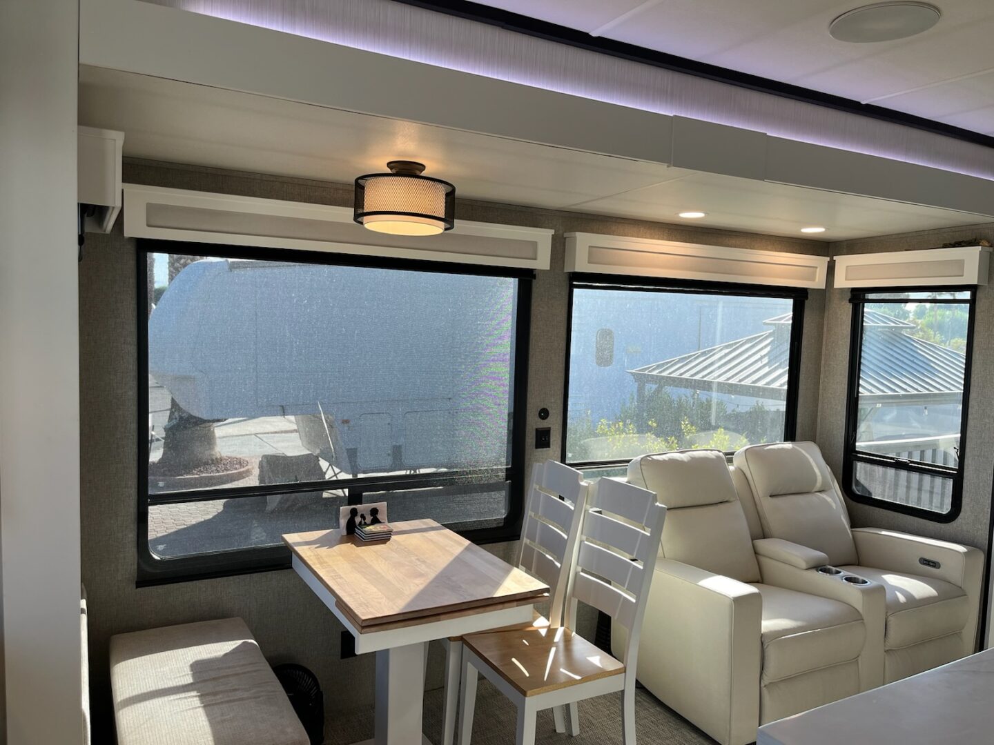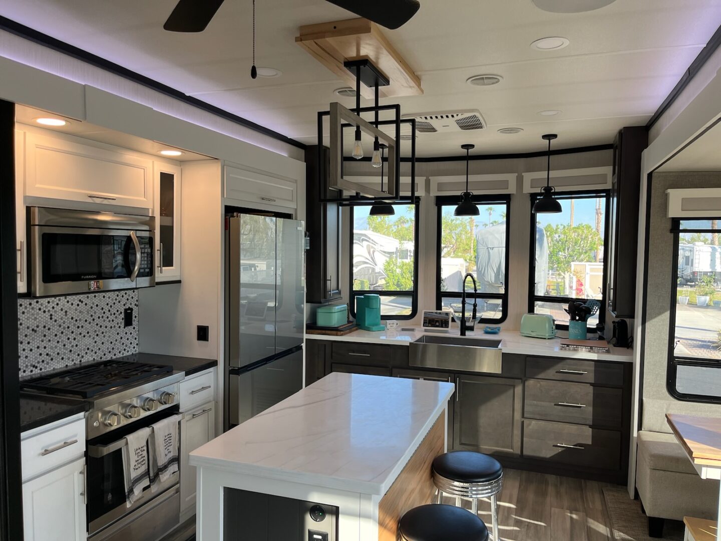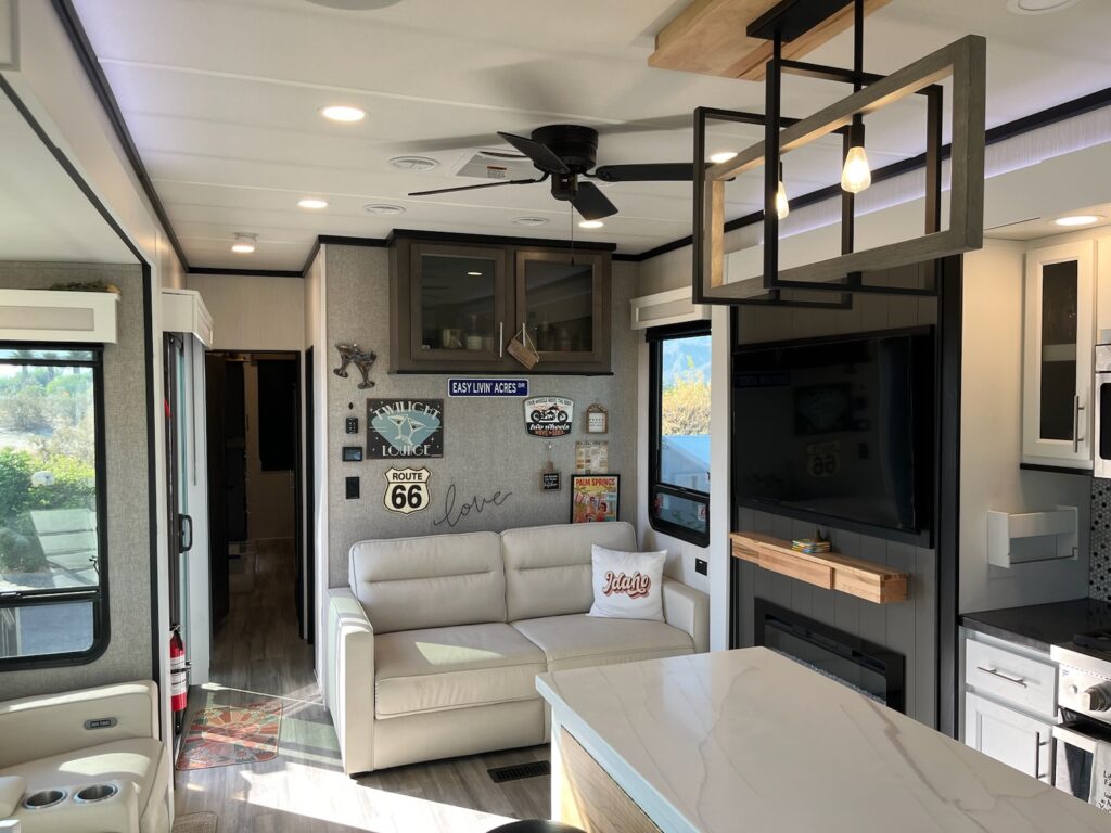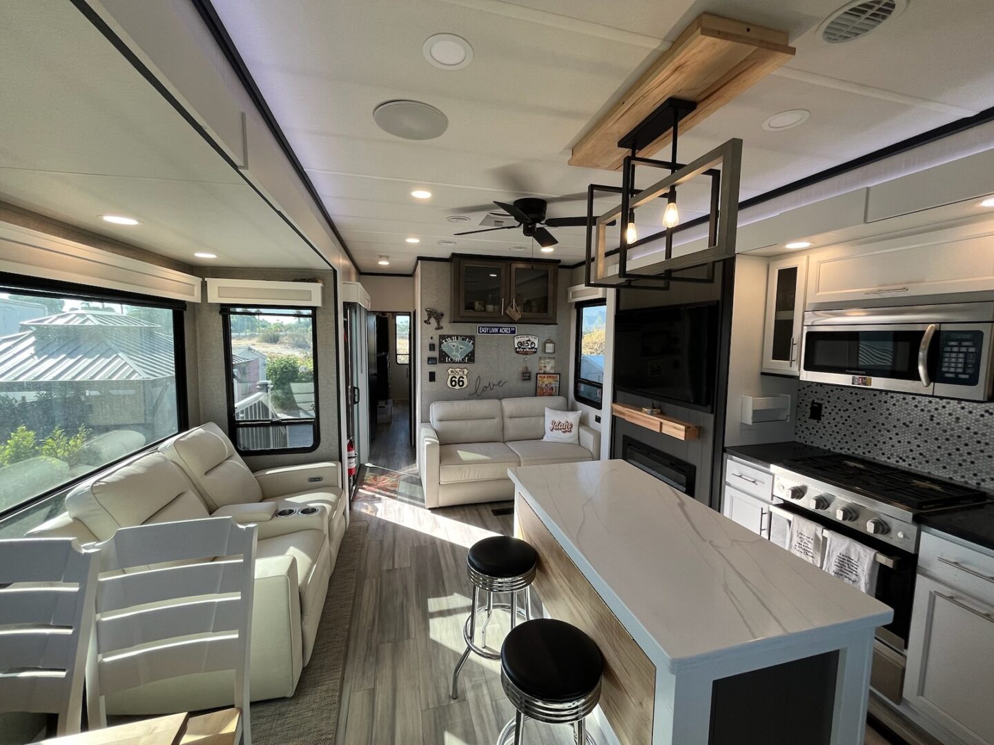 The open kitchen features a large hidden Murphy pantry providing excellent space for groceries and supplies. The trailer toilet has been replaced with a residential toilet for added comfort. Additional features include USB ports throughout the home.
