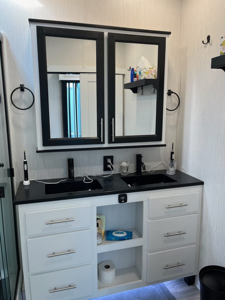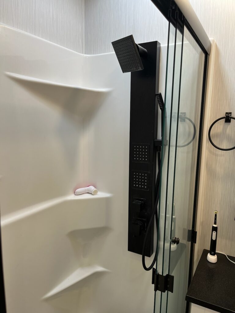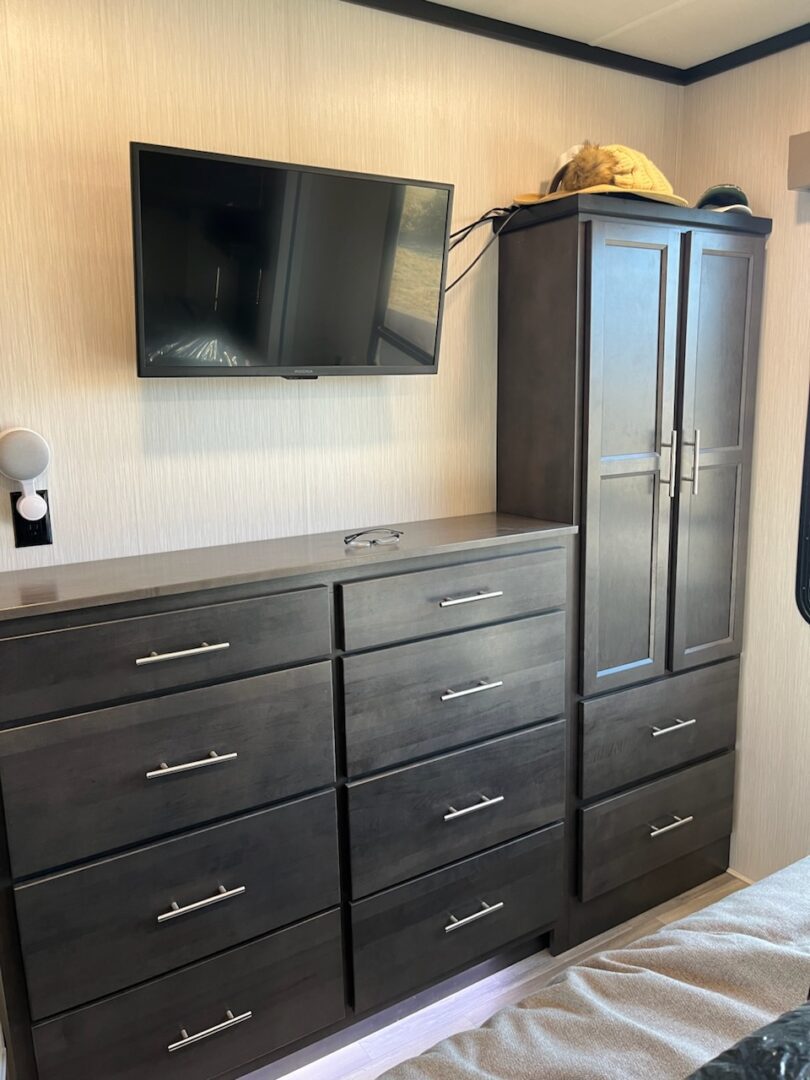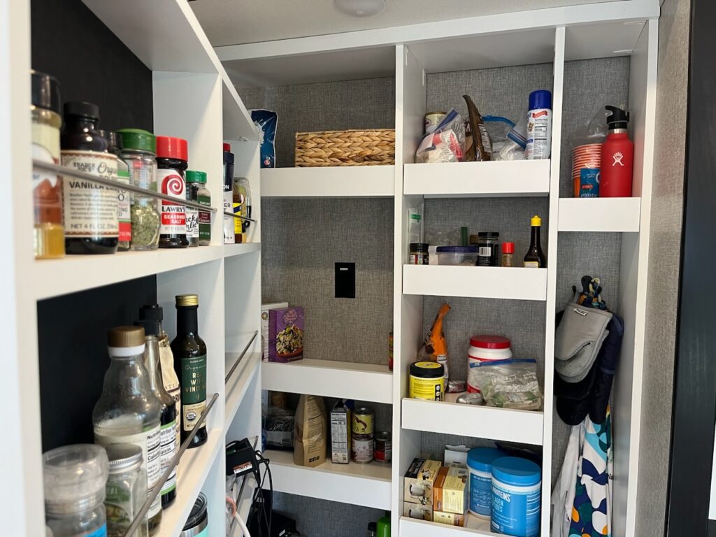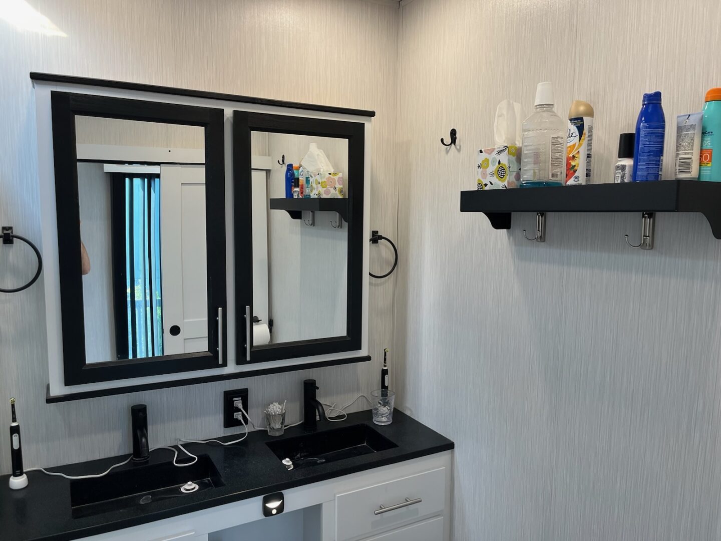 The open kitchen features a large hidden Murphy pantry providing excellent space for groceries and supplies. The trailer toilet has been replaced with a residential toilet for added comfort. Additional features include USB ports throughout the home.